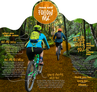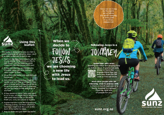 This creatively designed leaflet is for a Christian leading a young person to Follow Jesus. There is a 'tear-off' side piece that gives guidance how to talk to young people about following Jesus. The main leaflet is given to the young believer to start their own faith journey. There is a QR code which scans to SUNZ Engage Bible Reading App